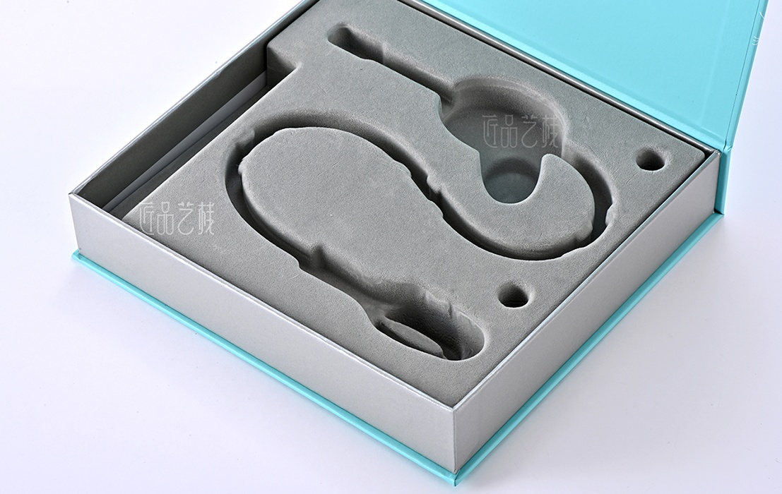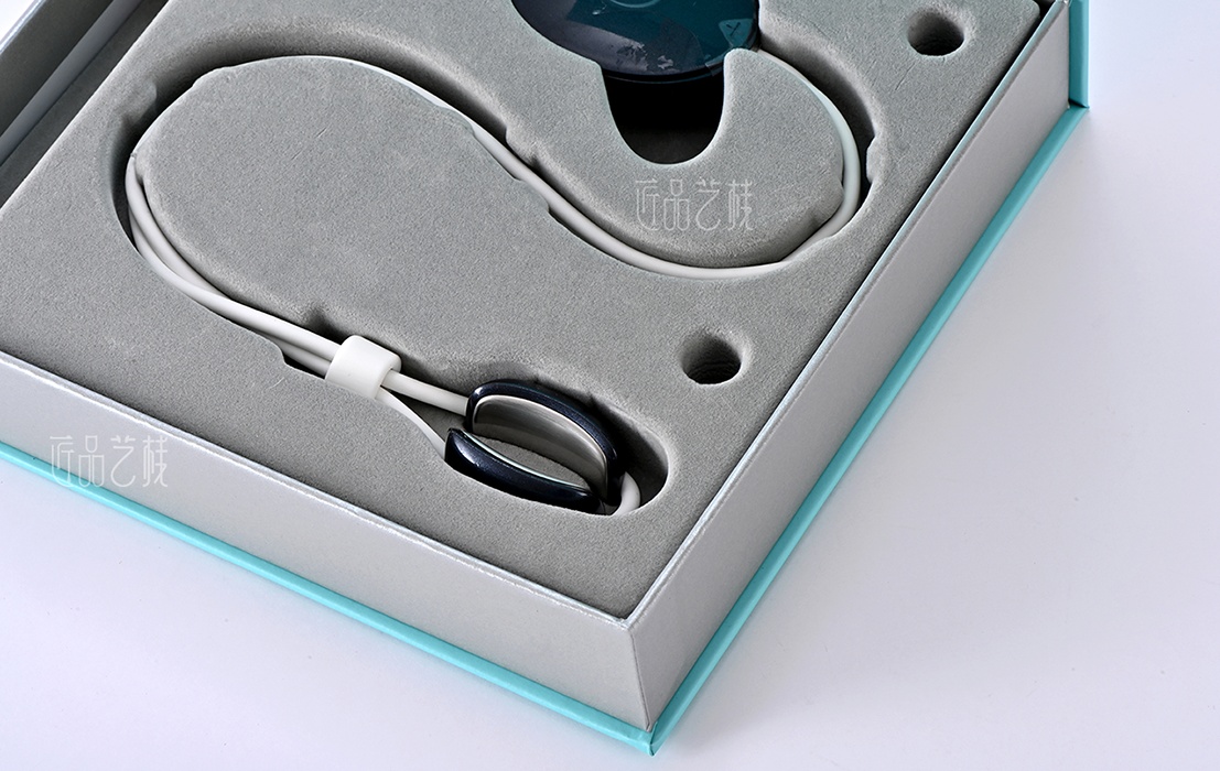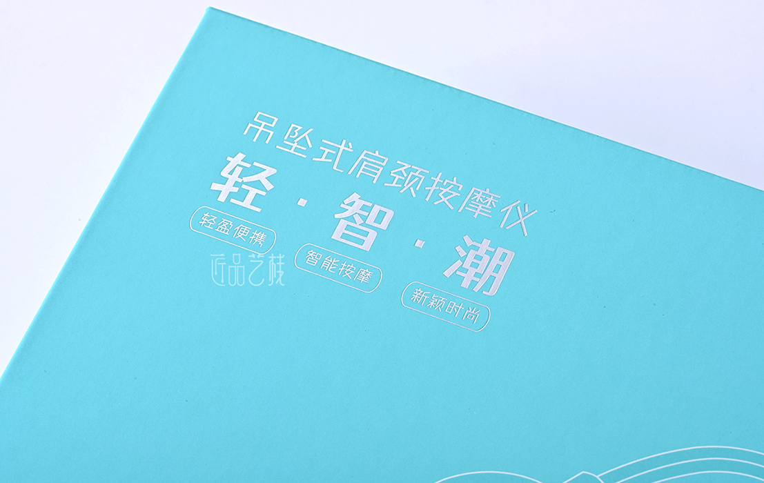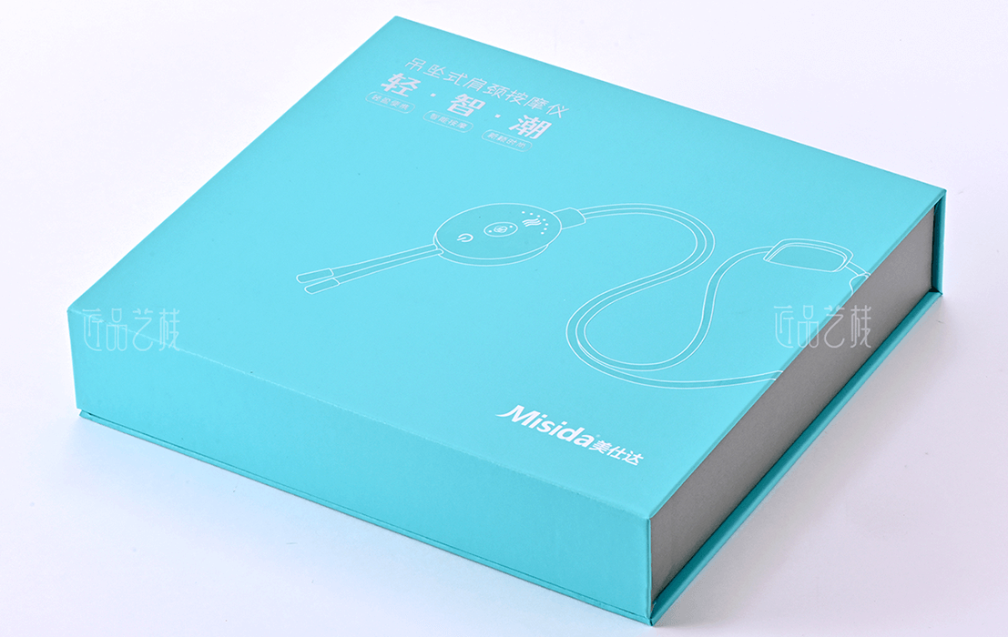在該肩頸按摩儀包裝盒定制合作中,以簡約時尚的藍(lán)色調(diào)為基,