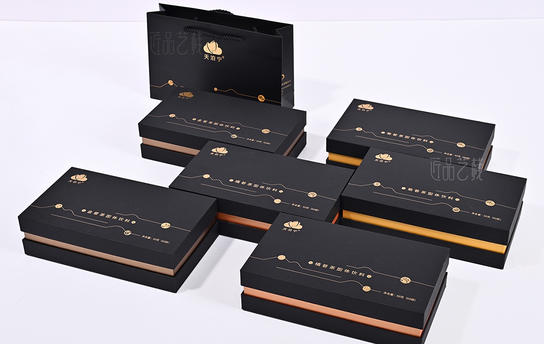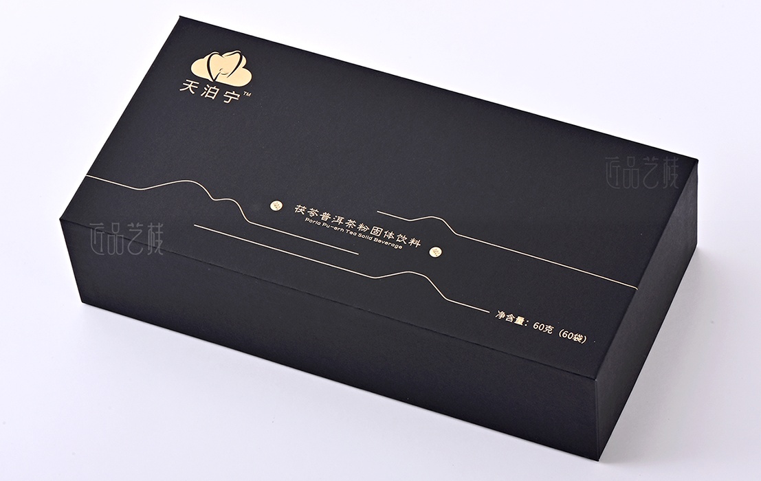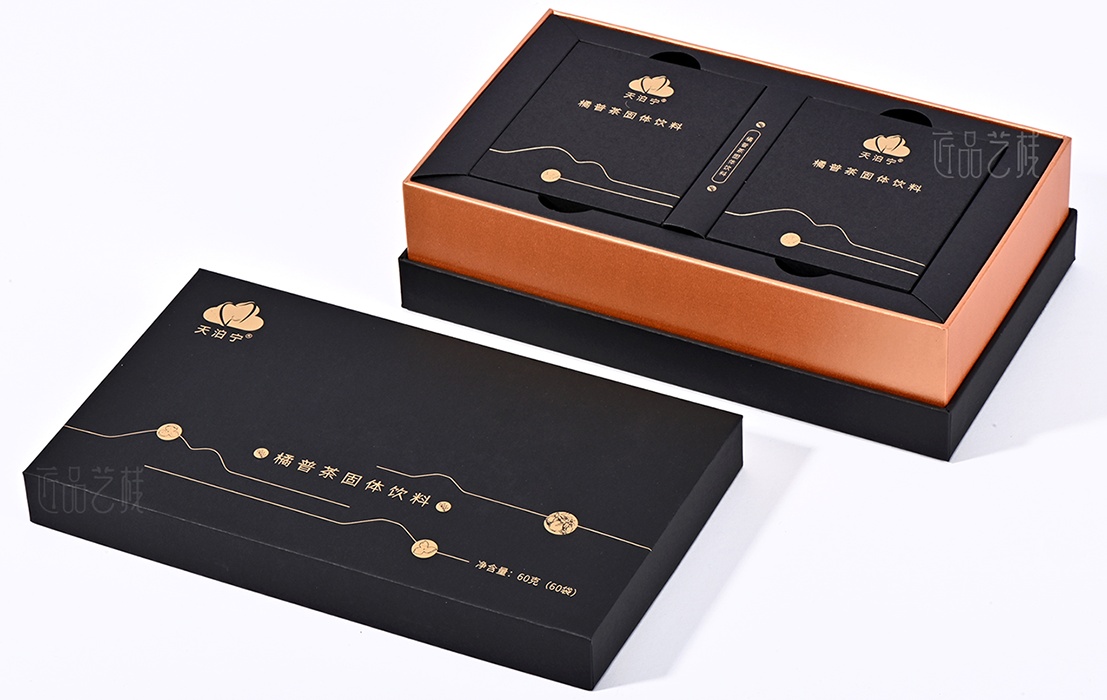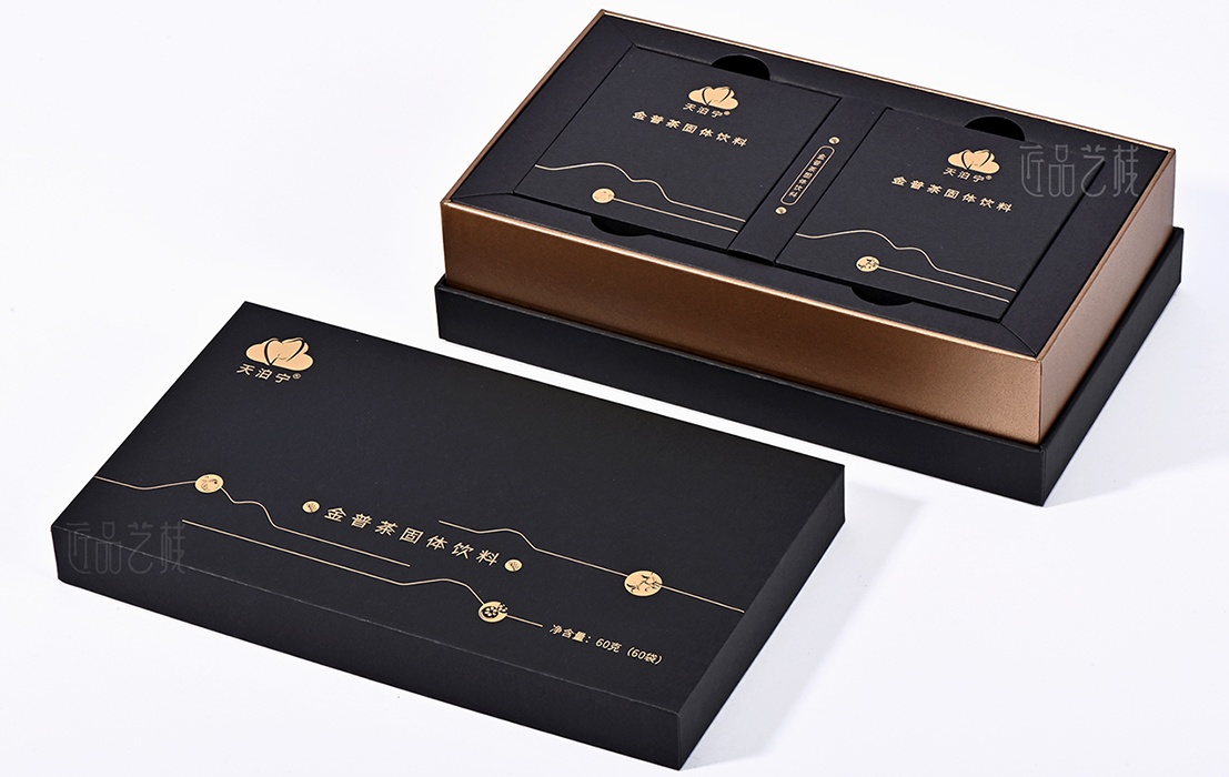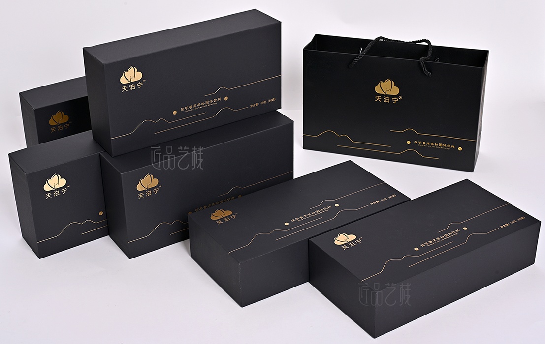 依托a級黑色卡紙為包裝盒主體,點(diǎn)輟精致燙金工藝,