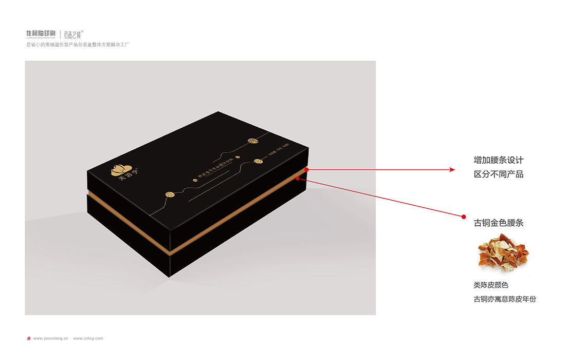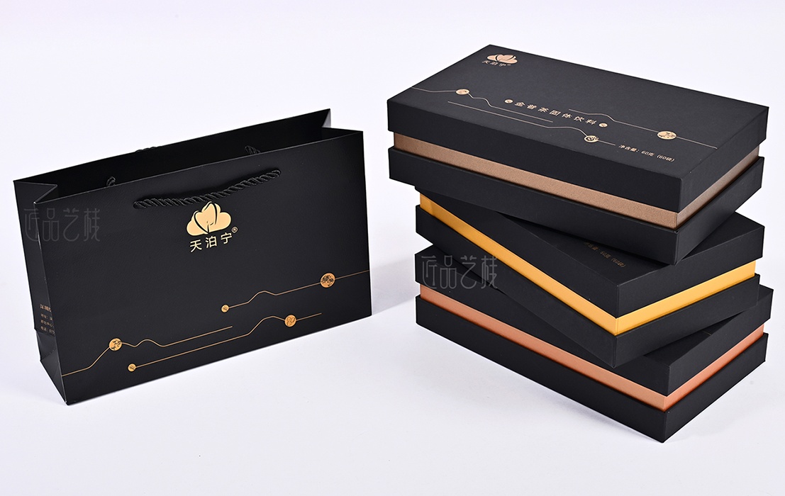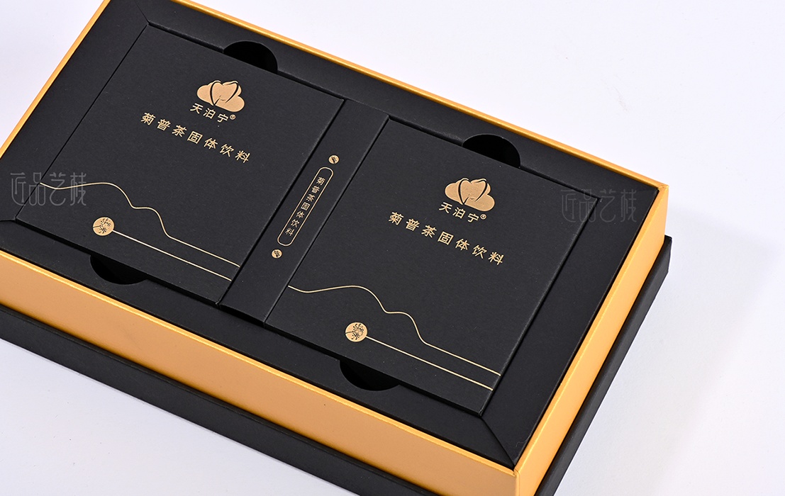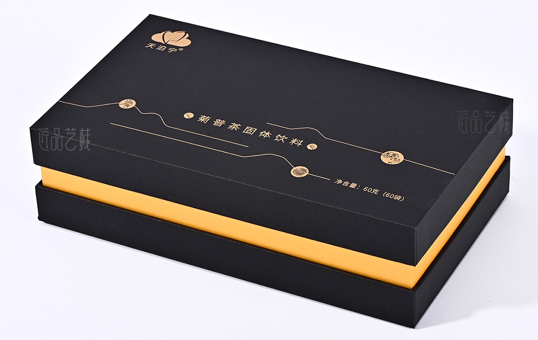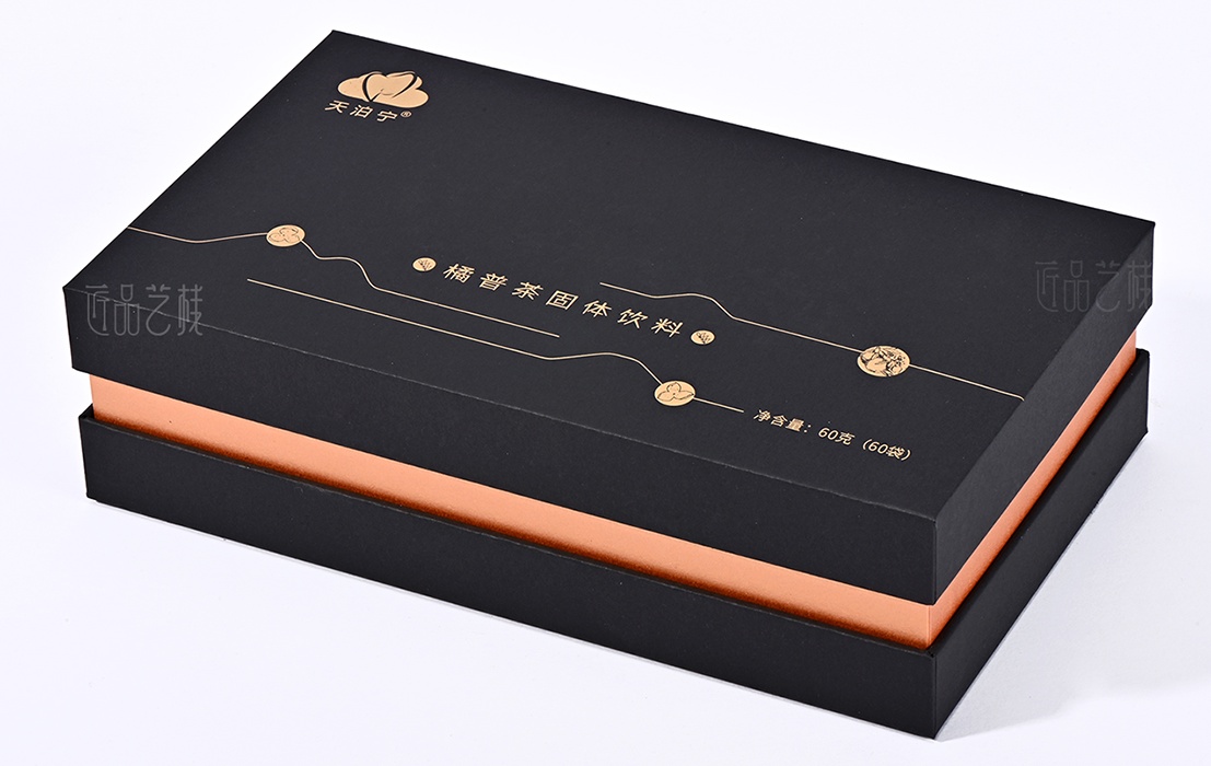依托a級黑色卡紙為包裝盒主體,點(diǎn)輟精致燙金工藝,